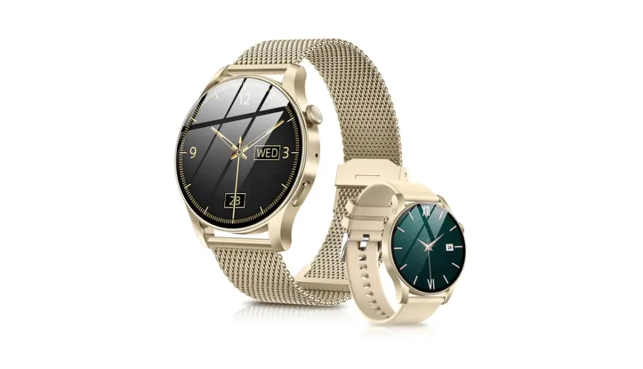 丸型×ゴールドはやわらかい高級感があり、レビューでもデザインの満足度は高め。 初めてのスマートウォッチでも、腕元が浮きにくいのは安心材料です。